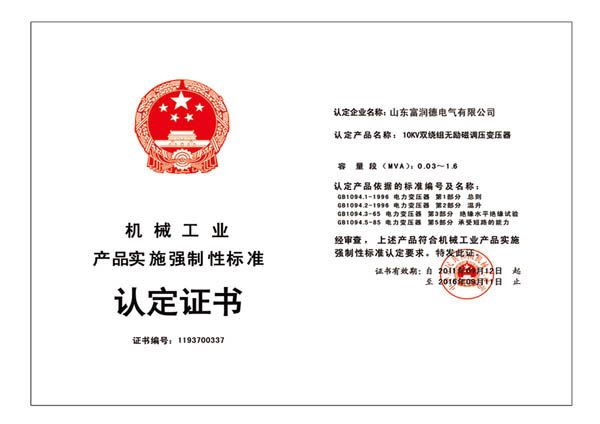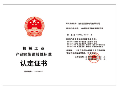 機(jī)械工業(yè)產(chǎn)品實(shí)施強(qiáng)制性標(biāo)準(zhǔn)認(rèn)定證書 -
