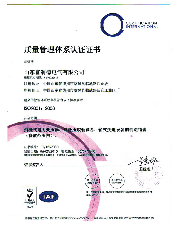 ISO9001:2008質(zhì)量管理體系認(rèn)證證書 -